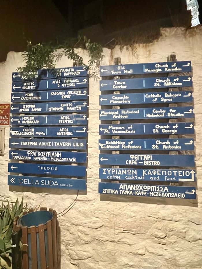 Once you’ve arrived at the Port or Airport its a short taxi ride up to Ano Syros – about 10 euro, or there are buses too.