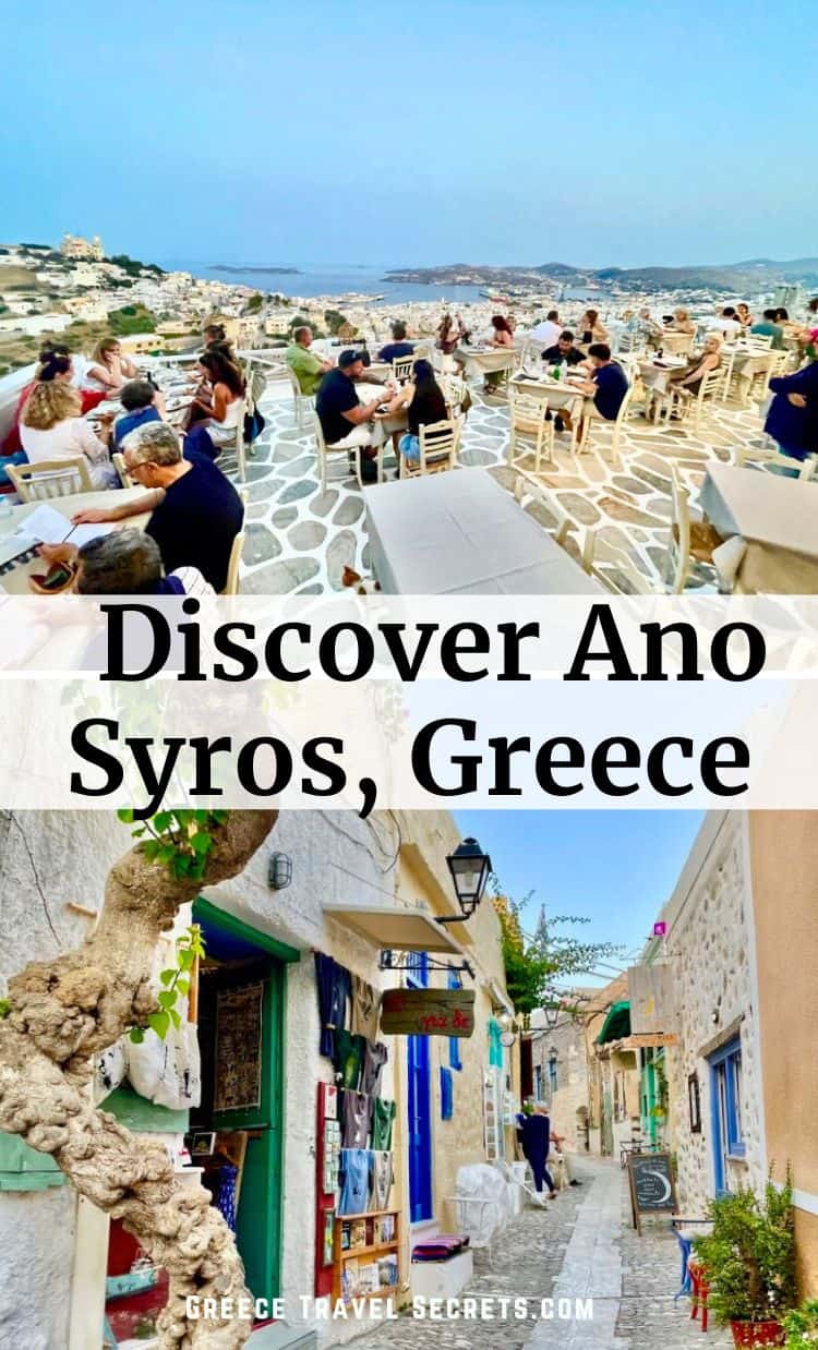 Ano in Greek means ‘upper’ or ‘above’ in Greek. Ano Syros is located on the island of Syros, which is part of the Cyclades archipelago in the Aegean Sea, Greece.