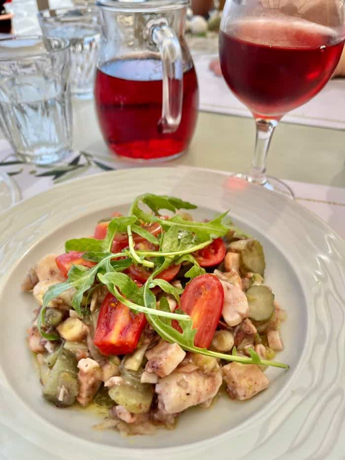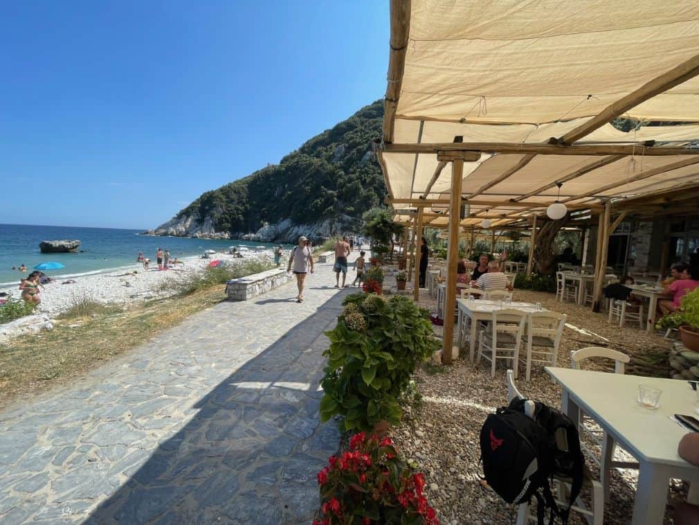 There is one taverna at the beach called Old Damouchari where you can get a fantastic octopus salad and cold beer, overlooking the beach.