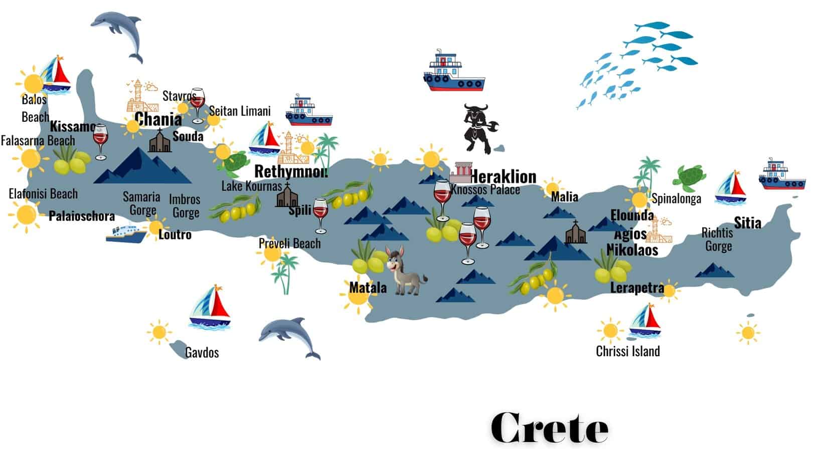 Knossos Palace, the Samaria Gorge, Elafonisi, Balos, Falasarna and Seitan Limani Beaches, Chania & Rethymnon Old Towns, Spinalonga and the Palace of Phaistos, and lots more!