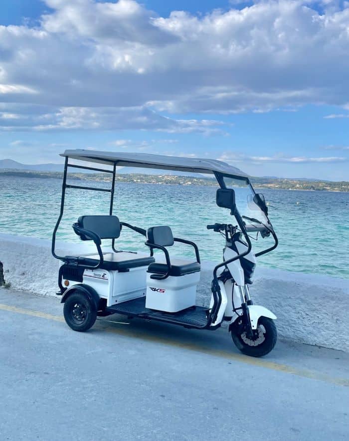 - Electric Tricycles and Mobility Scooters: There are no private cars or taxis on Spetses and an ATV is not usually a good idea. But you can rent an electric tricycle or mobility scooter to explore the island at your own pace. This can help you navigate the streets and reach various points of interest comfortably. With so little traffic and no mountains, it’s a pretty easy island to explore.